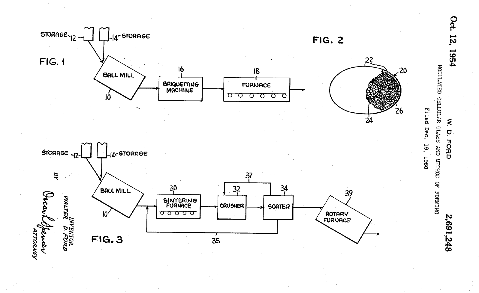 US patent 1945052 is generally considered to be the basic patent of the former cellular glass production in the west. Bernard Long, working at St. Gobain Glass was the inventor. However, this patent does not describe the powder method today used. The patent describes two recipes for the melting furnace, which gives a multicellular glass without and with reheating . The first recipe without reheating produces a “foam” of 1800 kg/m³ while the second one with reheating allows a density of 800 kg/m³. Even the lowest density is far from the commercial densities between 100 and 200 kg/m³. For these densities, the powder method was later on developed.