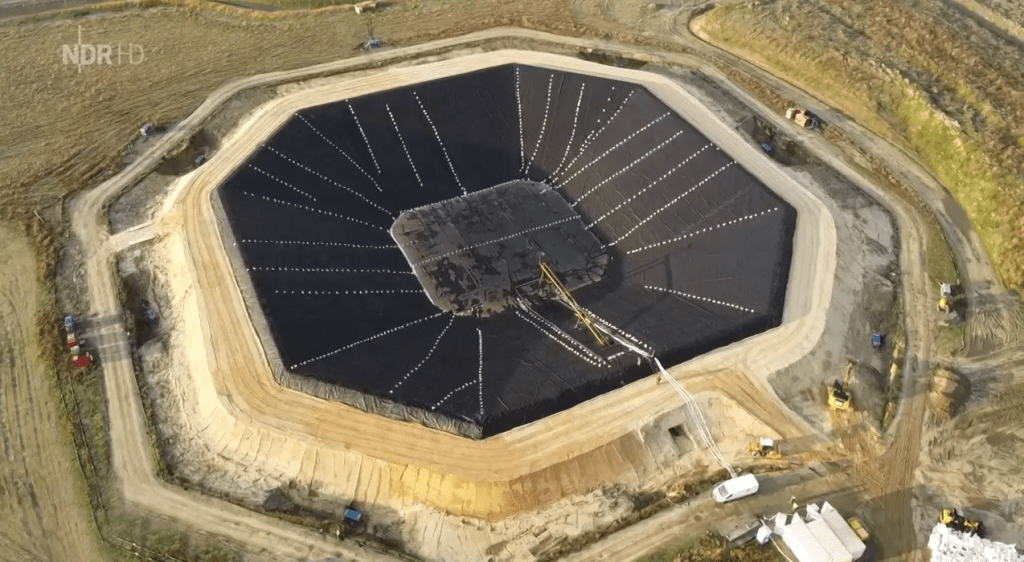 In Meldorf, Germany, the first Pit Thermal Energy Storage (PTES) is build to heat public buildings in winter by Ramboli and Solmax. First a large pit is dug (100m x 100) like shown hereunder.