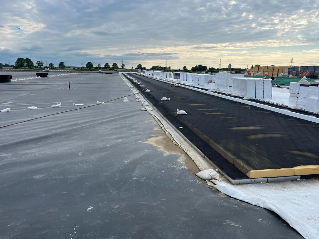 The pit is filled with water and an 2.5mm HDPE-foil is covering and floating on the water. It is perfectly possible to walk on this HDPE-foil. On this foil, a layer of Glapor PG600 cellular glass is installed (800 x 600 mm boards) and later on a layer PIR and tapered EPS is installed. On top of the EPS, a rain-membrane is installed, where the tapered is installed in such a way that the rain water can be easily drained. Hereunder, the installation of the cellular glass and PIR on the HDPE-foil is shown.