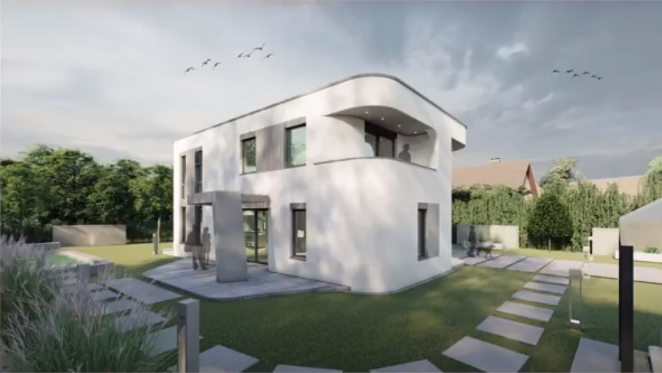 The movie shows the use of cellular glass gravel and the printing of the house, layer by layer. In fact, the house was printed by only two people and a huge cement mortar printer. The challenge was to develop a mortar, which allows printing but which does not flow after printing.