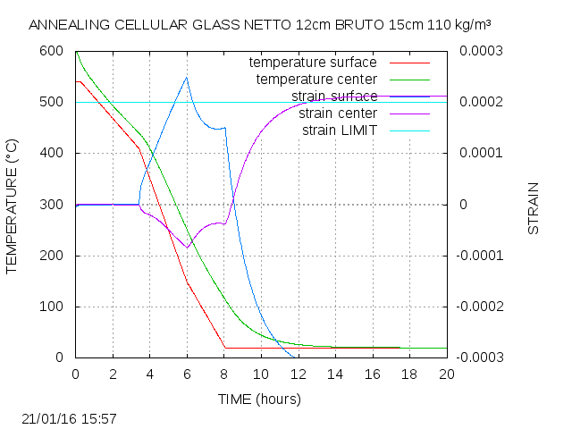 However, with software calculating the stress during and after annealing, the operator can predict breakage during or after annealing when he changes thickness, temperature curve, density, speed, etc. Production losses due to annealing problems will be largely reduced. Annealing is considered to be satisfying when there is no breakage during production, in the ware house or due to one-side contact with hot bitumen at maximum use temperature (220°C). The last situation is typical for cellular glass, installed on a flat roof, the main application of cellular glass.